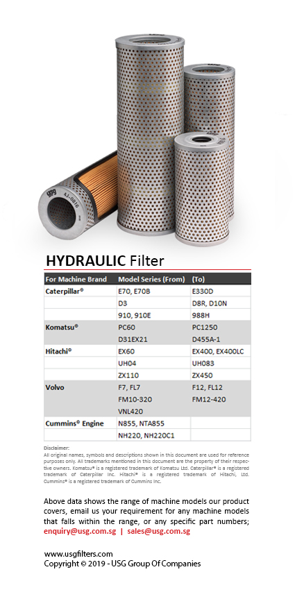 USG® offers the premium quality filtration media in each filter assembled and all our filters are subject to vigorous laboratory tests including structural integrity, pressure drop, filtration efficiency and capacity. Our filtration line supports machinery of Caterpillar®, Komatsu®, Hitachi®, Volvo®, and Cummins®.
